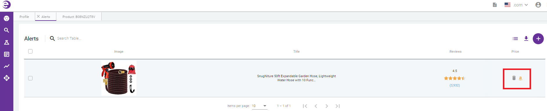 - Icons - If you hover your mouse pointer over the last column on the right side of each product, you will see an Amazon icon that takes you to the Amazon product page. Beside it is a Trash icon that allows you to delete an item from your list.