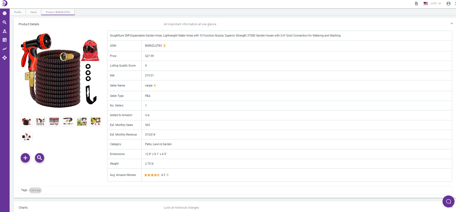 - Product Details - Clicking on theProduct Image will take you to the Product Details Page where you can see all the metrics Egrow tracks for all Amazon products, this includes charts with historical data for the Est. Sales, BSR, Reviews, Price, and much more